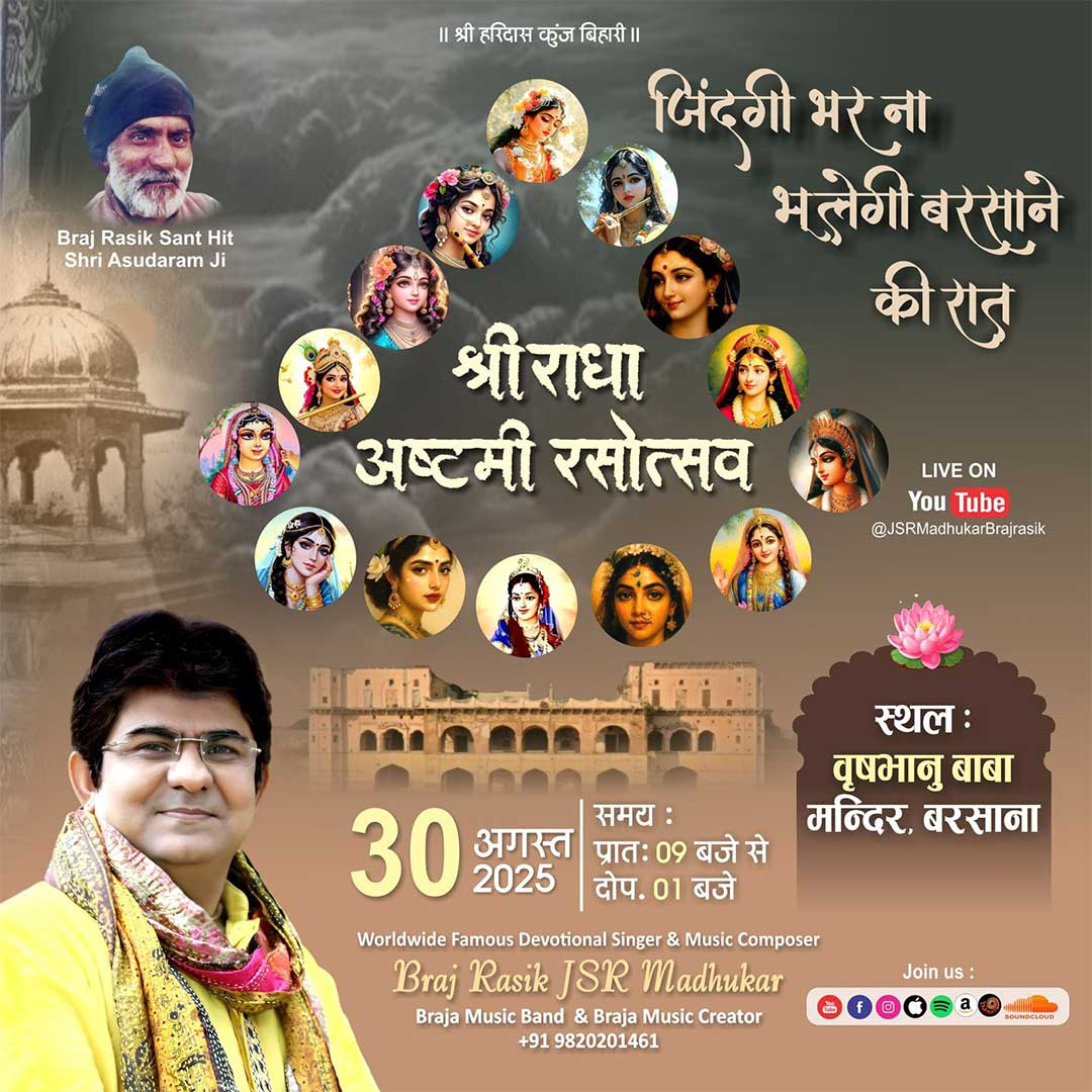 J.S.R. Madhukar was born on 22nd February, 1971 in Shri Vrindava Dham, Uttar Pradesh. Vrindavan Dham is accepted as the most glorious and is itself Goloka of the spiritual world. Vrindavan Dham is also histrorically connected to Sangeet Samrat Shri Swami Haridas Ji.