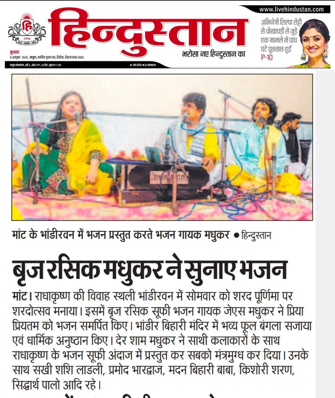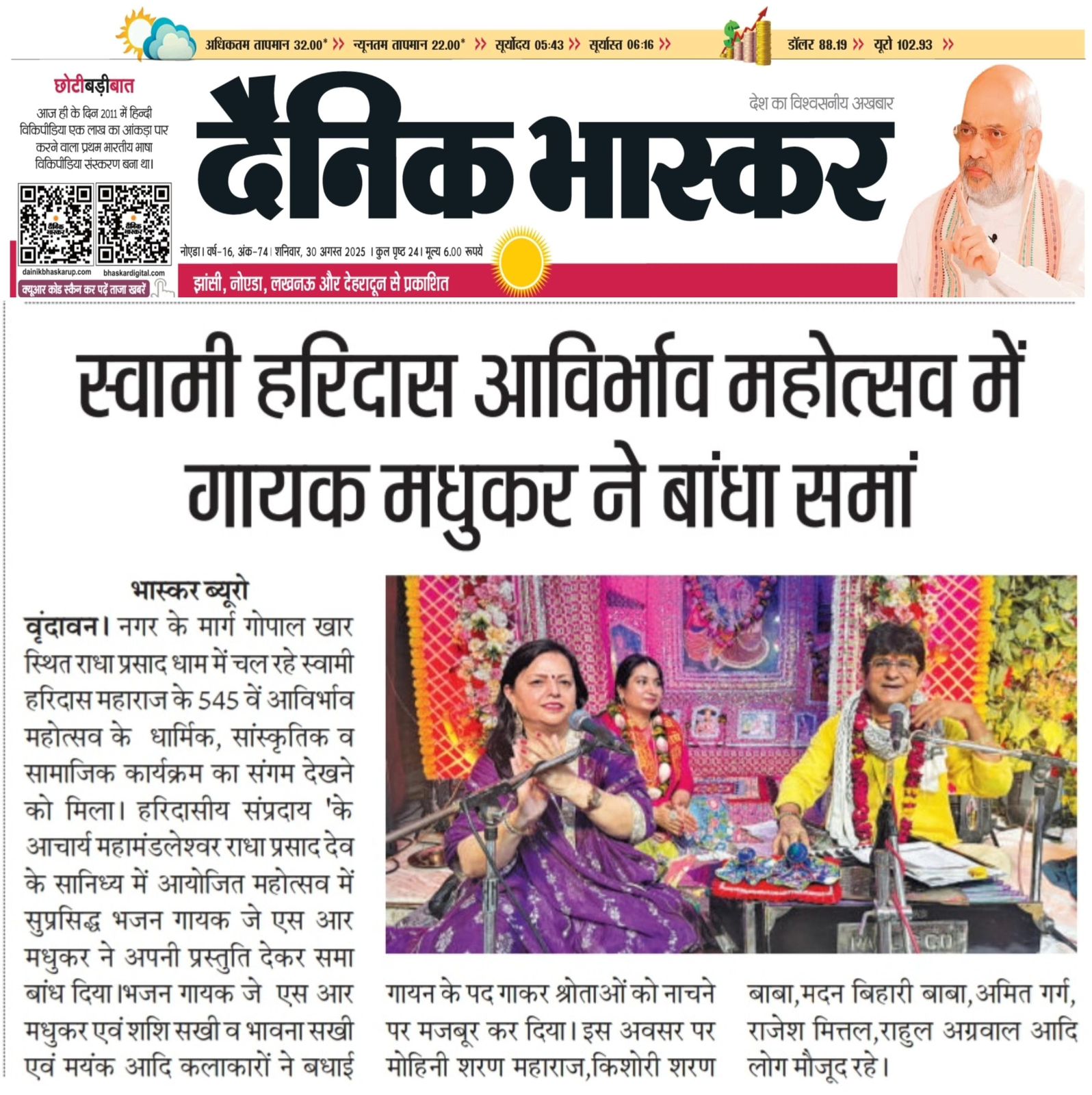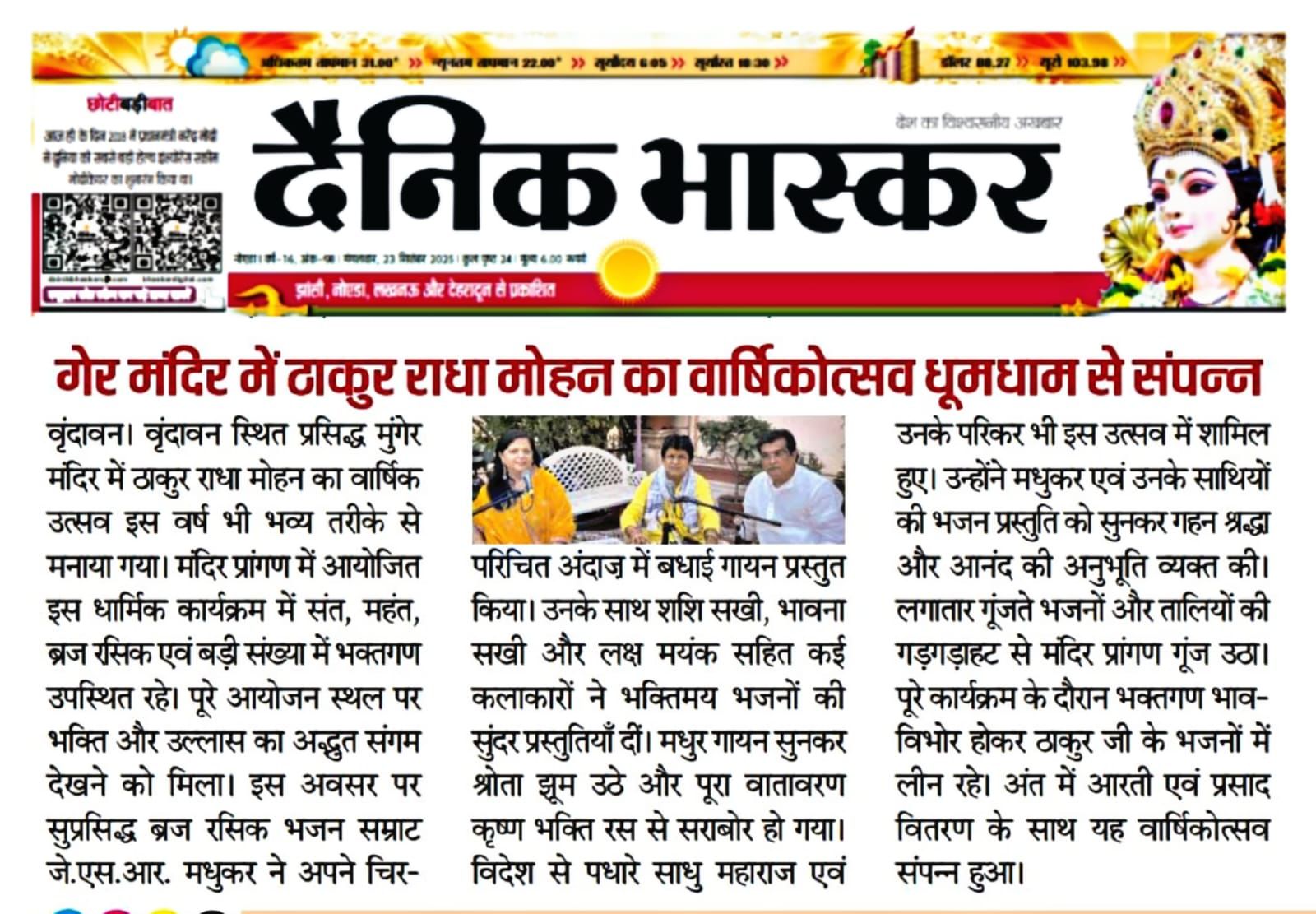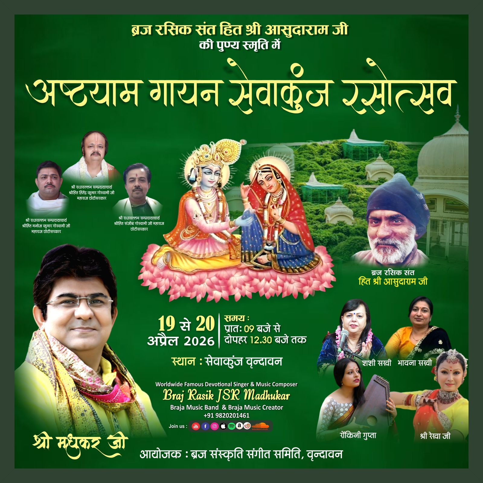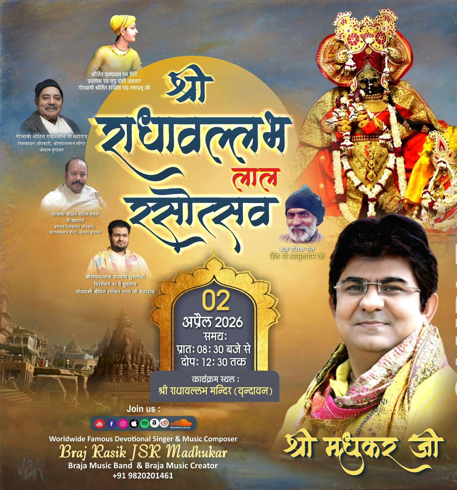 J.S.R. Madhukar was born on 22nd February, 1971 in Shri Vrindava Dham, Uttar Pradesh. Vrindavan Dham is accepted as the most glorious and is itself Goloka of the spiritual world. Vrindavan Dham is also histrorically connected to Sangeet Samrat Shri Swami Haridas Ji.