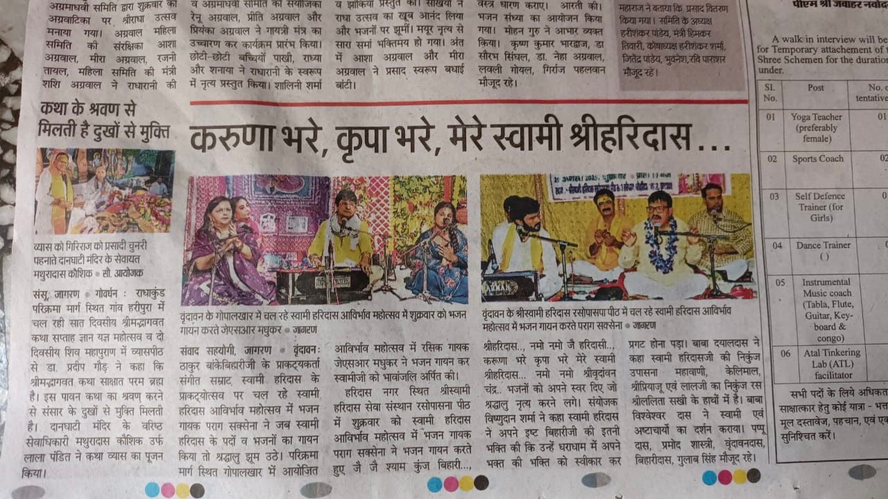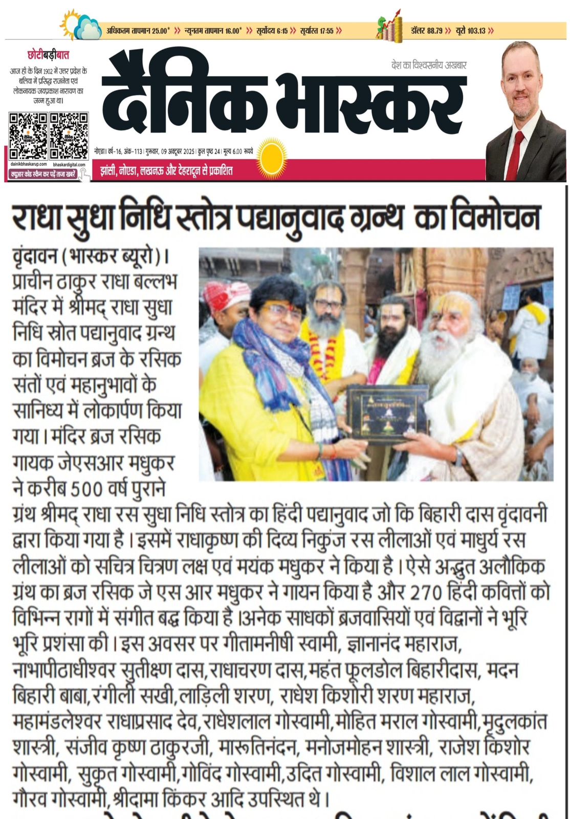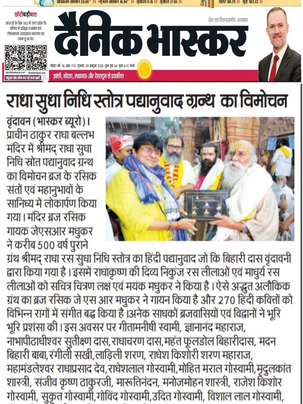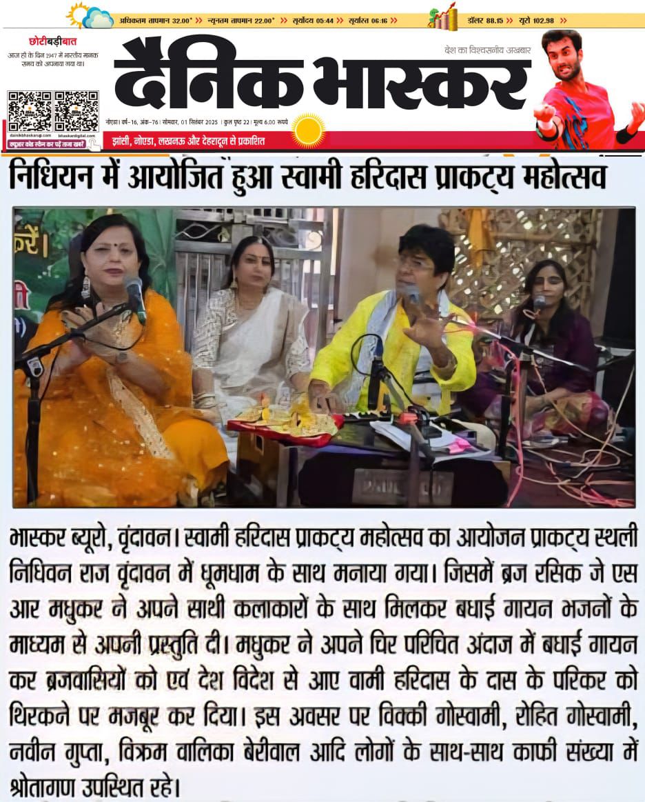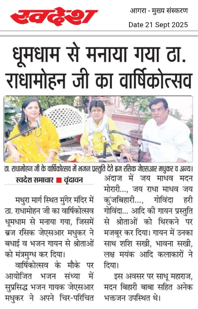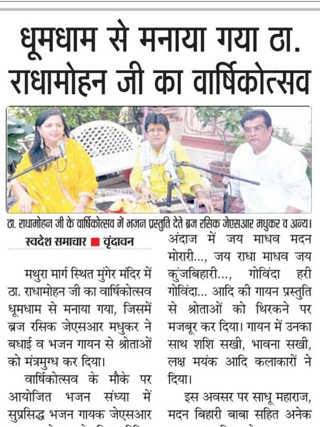 J.S.R. Madhukar was born on 22nd February, 1971 in Shri Vrindava Dham, Uttar Pradesh. Vrindavan Dham is accepted as the most glorious and is itself Goloka of the spiritual world. Vrindavan Dham is also histrorically connected to Sangeet Samrat Shri Swami Haridas Ji.